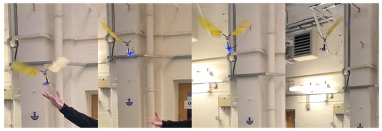 Compared to the initial 2.6 g FWR prototype model that achieved vertical take-off in 2017 [13], shown in Figure 22a, the current flight test model has nearly doubled its wing area and generated ten times greater lift. Regarding power efficiency, the current FWR-MAV model achieved 0.02 N/W. For a previous tethered flyable model [16] with a similar weight of 22.7 g without an onboard battery, shown in Figure 22b, the coreless motor had a continuous power of 15 W and a rated voltage of 7.4 V. Since 9V from a DC supply was used for take-off with wires, the input power exceeded the motor-rated power. Based on the rated current, at least 18.24 W was needed for the 22.7 g model to take off, resulting in a power efficiency of 0.012 N/W. Compared to this, the power efficiency of the current FWR-MAV model has improved by 66.7%.