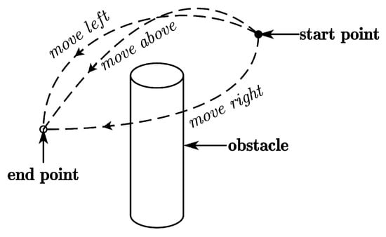 We also evaluated our method in multi-obstacle scenarios, comparing it to off-the-shelf robotic movement adaptation algorithms like the sampling-based RRT-Connect [] and probability-based STOMP []. Focusing on multiple hazardous obstacles (see Figure 4), infinitely high obstacles (see Figure 5c), and varying relative positions for multiple obstacles (see Figure 5a,b), we changed the relative positions of the obstacles across 30 configurations in each scenario.