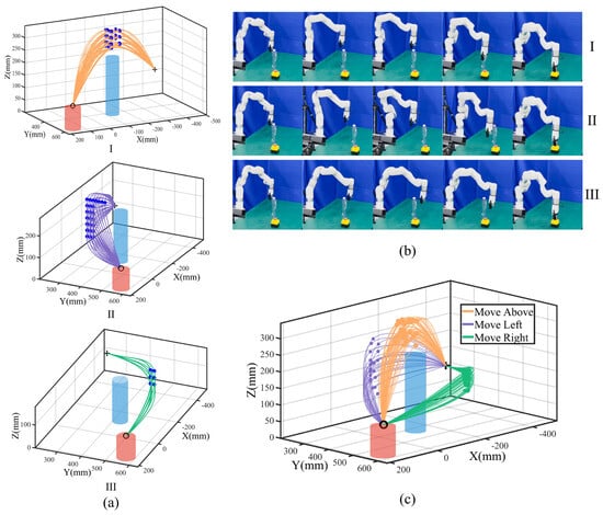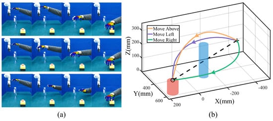 During task execution, the start point is fixed to ensure repeatability, while the end point is determined dynamically based on emergency stop poses detected by YOLO []. This integration of real-time object detection enhances the system’s safety and adaptability, allowing for robust performance in unpredictable scenarios. The trajectory acquisition process and corresponding template trajectories are shown in Figure 2a,b.
