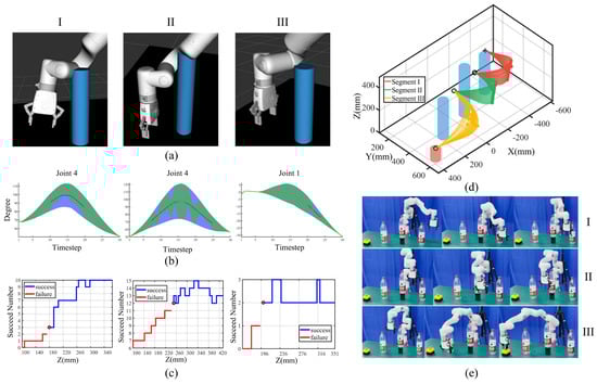 For threshold determination, the robot automatically selects the same via-point range as in the initial generalization process and records the number of valid timesteps within the joint range and the corresponding obstacle avoidance results. A threshold is then established, where the robot executing the tasks is considered successful if the number of valid timesteps exceeds the threshold and is considered to have failed if it falls below. The threshold determination results are shown in Figure 4c, and the robot task execution results are shown in Figure 4d,e.