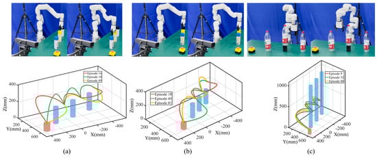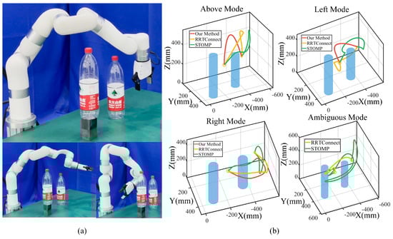 Furthermore, we set different relative obstacle positions and set the obstacle height to be nearly infinite. We chose three spray paint cans with different colors in two cases, where the gripper is between and above two adjacent obstacles, and set the water bottle height to 1000 mm. We repeated 100 experiments and recorded the total time as 3.25874 s, 2.45945 s, and 0.87882 s, with the results shown in Figure 5. For different relative obstacle positions, there are no timesteps violating task constraints with the trajectory directly utilized for task execution sampling from three modes. For nearly infinitely high obstacles, robot links 6, 5, and 4 will always collide at some timesteps, and the probability of satisfying task constraints always becomes 0. We thus exclude those modes, retaining only the remaining mode, and all experiments exhibit a 100% success rate.