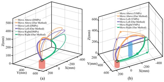 For template trajectory generation, we selected the single-obstacle task scenario in Section 4.1 and generated template trajectories utilizing both our method and DMPs, with visualized trajectories shown in Figure 6a. The results illustrate that our method preserves the human demonstration characteristics even when the task start and end points change. However, DMPs will lose demonstration information; the trajectories attached to the above and left modes will be generalized to the right mode. The reason is that DMPs are sensitive to the relative positions of the start and end points, leading to trajectories that deviate significantly from the demonstration.