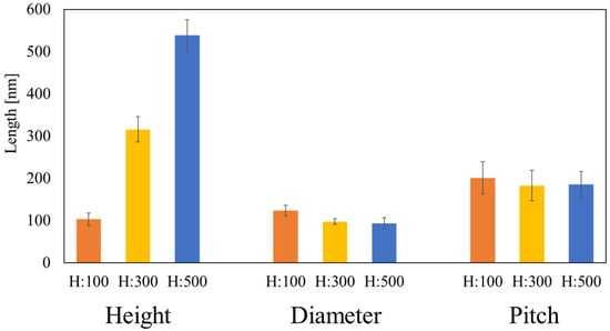 Dimensions of the fabricated nanopillars. Orange, yellow, and blue represent the specimens with H:100, H:300, and H:500, respectively.