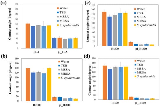 Contact angles of test specimen surfaces with/without plasma treatment for five solutions. The specimen height ranged from 100 to 500 nm. (a) FLA, (b) H:100, (c) H:300, (d) H:500.