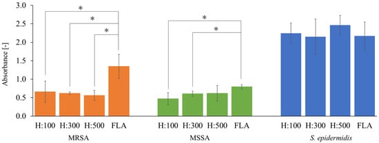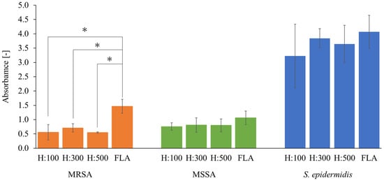 In the case of MSSA, significant biofilm suppression was observed on H:100 (Abs. = 0.47 ± 0.16, p = 0.020 < 0.05) and H:300 (Abs. = 0.61 ± 0.072, p = 0.007 < 0.05), compared to FLA (Abs. = 0.80 ± 0.060). The inhibition rates were 40.8% for H:100 and 23.9% for H:300. However, for H:500, no significant suppression was observed (Abs. = 0.62 ± 0.21, p = 0.21 > 0.05).