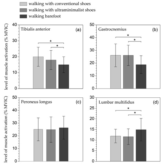 - Franklin, S.; Li, F.X.; Grey, M.J. Modifications in lower leg muscle activation when walking barefoot or in minimalist shoes across different age-groups. Gait Posture 2018, 60, 1–5. [Google Scholar] [CrossRef]