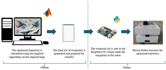 The workflow for achieving an optimized trajectory operates as follows: first, the environment is modeled as a map, and the bio-inspired algorithms are implemented in MATLAB 2021b to compute the optimized trajectory. Once the final waypoints of the optimized trajectory are obtained, they are transferred to a Raspberry Pi. The Raspberry Pi runs a Python script that sequentially sends commands to the real robot, enabling it to follow the calculated trajectory within the actual environment. This process is schematically illustrated in Figure 4.