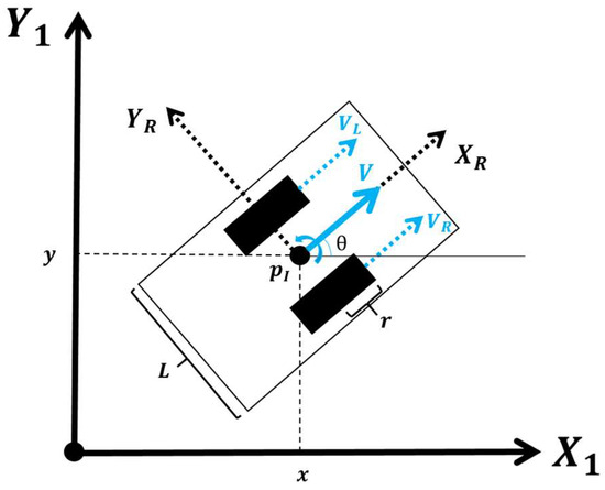 The left and right wheel speeds are regulated by a controller so as to follow a specified longitudinal and angular velocity profile, which can be modeled using Equations (3) and (4).