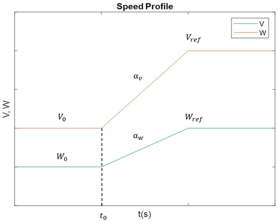 The velocity profiles defined by Equations (4) and (5) are illustrated in Figure 7, where the red line represents the longitudinal speed and the blue line the angular speed.