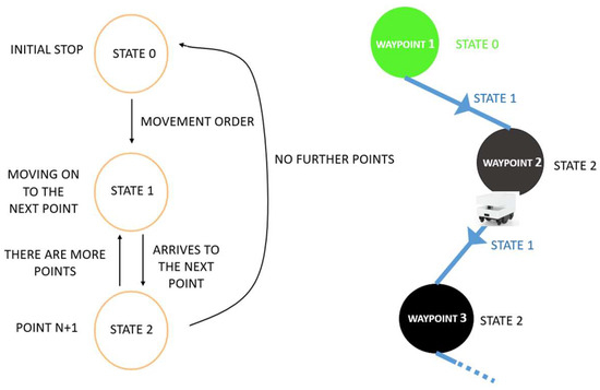 To determine the most efficient path within a designated area, allowing the autonomous robot to UVC disinfect that space, specific waypoints are defined to trace the disinfection path. The robot is programmed to recognize a fixed sequence of coordinates and move through them in a predetermined order. Its motion is governed by a state machine, shown in Figure 9 (left), and Figure 9 (right) shows the states reached along its path. This approach is followed by the robot path simulation (offline process in Figure 4) and by the Raspberry to send the positions to the Hussar robot (online process in Figure 4).