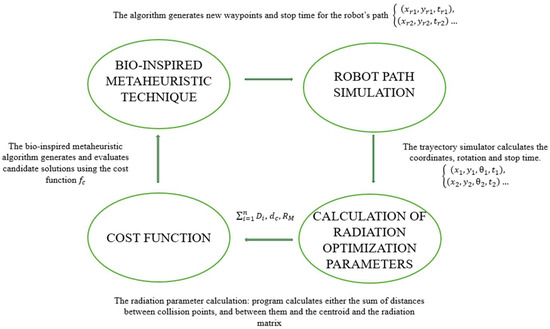 After simulating the path, the radiation parameters are calculated. This module calculates the cumulative radiation coverage based on the distance between points , the distances to collision points , and the robot’s position relative to the centroid and the radiation matrix .