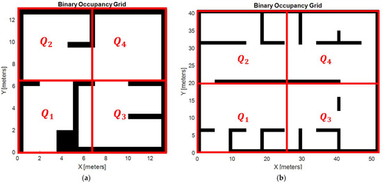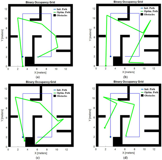 The centroid represents the geometric center of the set of waypoints along the route, so the distance to centroid metric makes the algorithm find more centralized and compact routes. At this stage, the cost function penalizes trajectories where waypoints are too clustered, promoting routes that are more evenly distributed along the disinfection area. Specifically, this stage of the cost function is triggered when there is fewer than one waypoint in each quadrant , ensuring balanced coverage across the space (Figure 11a,b). The goal is to avoid excessive concentration in certain areas, which could lead to local minima that would make coverage redundant and travel time inefficient.