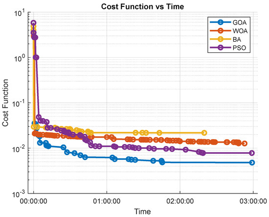 At the end of the experiment, the final cost function values for each algorithm describe their performance in this complex environment. The GOA achieved the lowest final cost function value, 0.00328, indicating a highly efficient route with optimal radiation coverage. The BA followed closely with a final cost of 0.0033, also achieving complete and effective coverage but slightly less refined than the GOA. The PSO ended with a cost function value of 0.00346, reflecting a good solution that ensures adequate coverage but with minor path inefficiencies. In contrast, the WOA’s final cost function value was significantly higher at 2.917, confirming its tendency to get trapped in local minima without achieving the optimal path required for comprehensive disinfection.