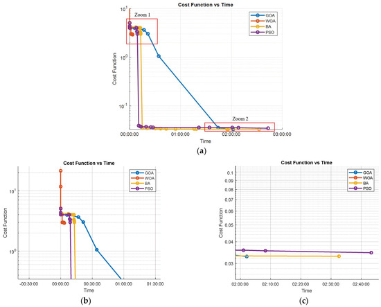 Finally, Figure 18a illustrates the variation in the cost functions of each method over time. As can be seen, the cost function of WOA gets stuck at a local minimum, while the other methods achieve reasonably good values that ensure complete radiation above the threshold required to disable COVID-19. This limitation of WOA may be related to the design of the algorithm, which mimics the behavior of whales following a leader during hunting. Unlike the other algorithms, WOA lacks any mechanism to escape from local minima. Figure 18b,c provide a more detailed view of the final cost function values shown in Figure 18a for a better comparison.