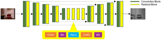By layering a sufficient number of ResBlocks, latent features implicitly encode characteristics for generating depth. The small spatial size of these highly encoded latent features holds necessary information used to reconstruct the target image, specifically the depth map. Batch normalization and ReLU layers follow every convolution layer except the last output layer. On the decoder side, the feature map size is doubled through up-sampling using bilinear interpolation. The depth map is effectively produced by the symmetric decoder using the latent features.