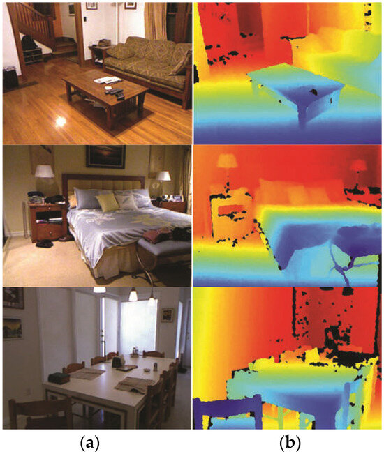 27] is widely employed in depth estimation analysis and consists of video recordings from 464 indoor scenes. For the purposes of experimentation, the dataset is split into 249 scenes for training and 215 scenes for testing. The RGB input images are resized from their original dimensions of 640 × 480 to 320 × 240 to standardize the input data. Thus, each depth frame is aligned with the nearest RGB frame in temporal proximity. This process necessitates discarding depth frames where multiple depth images correspond to the same RGB frame to maintain one-to-one correspondence. The camera projection parameters provided with the dataset are operated to align RGB and depth frames. Additionally, areas in depth images with invalid values—caused by reflective surfaces or windows—are masked out. The training set contains a total of 120,000 unique images. To address imbalances in the representation of scenes, the images are redistributed, resulting in an expanded training set of 220,000 images, ensuring approximately 1,200 images per scene. For evaluation, the model is tested on a subset of the NYU Depth v2 test set comprising 694 images, where missing depth values have been filled in. An example pair of RGB and depth images is depicted in