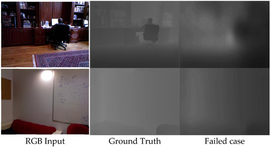 Figure 4 that other methods are unable to restore. The object boundaries are also successfully restored with clear corresponding regions. Based on these comparisons, the proposed method can provide reliable depth estimation using a single RGB image. The performance is quantitatively evaluated using the well-known RMSE for depth estimation.