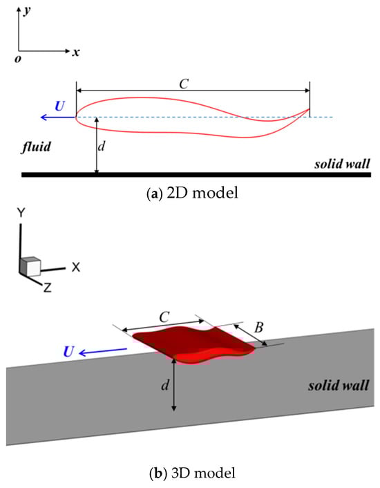 As shown in Figure 1, the NACA0015 foil is selected as the physical model, and the chord length is set as the characteristic length C. The 2D model and 3D model are shown in Figure 1a,b, respectively. The distance between the ground wall and the centre line of the foil is denoted as d; as for the 3D model, the aspect ratio is defined as AR = B/C, where B represents the span length. The travelling wavy motion is imposed on the foil, and the relevant expression is written in Formula (1), where λ is the travelling wavelength, f is the motion frequency, A(x) is the function of the travelling amplitude, and it is a quadratic function. In the current study, the value of a0 is fixed at 0.02, a2 = −2a1.
