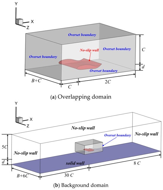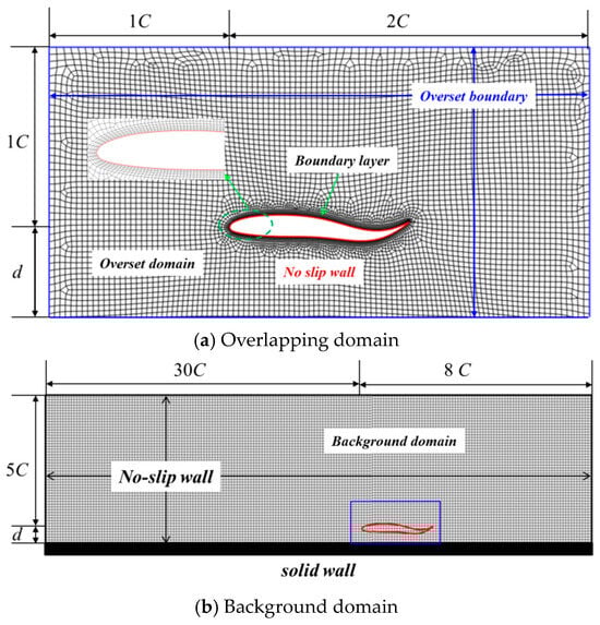 The computation domain in the current study consists of two parts: the background domain and the overlapping domain, respectively. As for the 2D condition (Seen in Figure 3), two rectangular-like domains were designed. Considering that the purpose of the current study was to investigate the ground wall effect, the length along the vertical direction should also vary with the wall distance. The geometric size of the overlapping domain was set as (x, y) = (3C, d + C), while the relevant size for the background domain was (x, y) = (38C, d + 5C). When it came to the 3D condition, as shown in Figure 4, two cuboid-like domains were designed, and the geometric size for the overlapping domain was designed as (x, y, z) = (3C, d + C, B + C). The corresponding size in the background domain of the 3D condition was (x, y, z) = (38C, d + 5C, B + 6C).