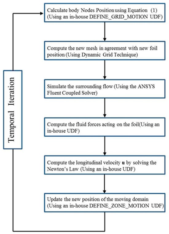 The current study involves the flexible foil’s positive deformation and the passive forward motion. In order to realize that several UDFs (User-Defined Functions) are written and embedded in the main solver of Fluent, the solve procedure is presented in Figure 6. As stated above, the flexible foil undergoes consistent travelling wavy motion all the time and the dynamic grid technique is employed to realize that. When the new position of foil is specified, the flow field around the foil is solved by the Fluent solver, and the relevant fluid dynamics acting on the foil are then acquired. In addition, Newton’s Second Law is adopted to calculate the corresponding value of acceleration at that time step. The calculation formula is expressed in Formula (4), where F is the fluid force, m is the mass of foil, and U denotes the moving velocity along the x direction. After that, the first-order explicit scheme is adopted to acquire the moving velocity of the foil at the current time step, as seen in Formula (5), where Fx is the horizontal force along the horizontal direction and Ut and Ut−Δt denote the moving velocity of the foil at the current and forward time step, respectively. Since the moving velocity is specified, the new position of the foil can be updated with the help of DEFINE_ZONE_MOTION. Until then, the calculation in the current time step is finished, and the calculation is repeated until the convergence criterion is satisfied. In the current study, if the difference in the foil’s fluid dynamics between two adjacent motion periods was less than 0.1%, the convergence could be considered satisfied.
