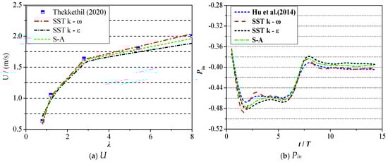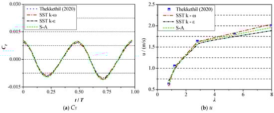 Concerning the 2D model, taking the results from Reference [24] as an example, the physical model in Reference [24] is a 2D NACA0014 foil, and the motion equation is identical to the current study. The validation test result is shown in Figure 7, where the variation curves of the thrust force coefficient are presented in Figure 7a, and the curve of forward velocity with respect to wavelength is exhibited in Figure 7b. The relevant motion parameters are set as a0 = a2 = 0, a1 = 0.1, f = 1, λ = 0.8. It can be vividly seen from Figure 7 that the overall changing tendency of the thrust force coefficient under three kinds of turbulent models agrees well with the results in Ref. [25]. However, when it comes to the value of moving velocity, the relative difference exhibits another phenomenon. When the wavelength lies in a small range [0.8–2.5], the relative difference is within 0.8%, and the results of the SST k–ω model present the best accuracy. With the further increase in wavelength, the relative difference between the results of the SST k–ω model and Ref. Reference [24] moves around 1.1%, while the corresponding value of relative difference under the other two turbulent models is pretty large (more than 12.5%). In view of that, the SST k–ω model will be adopted in the following calculation of the 2D condition.