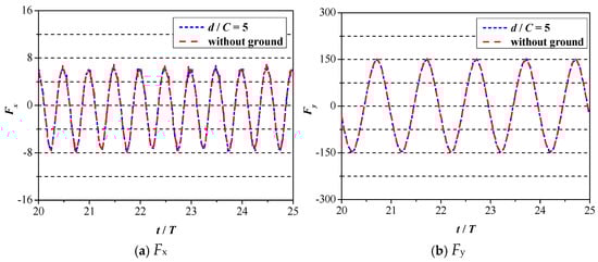 In this subsection, the effect of the ground wall on the propulsive property of 2D foil is analyzed. Before starting the research, the critical distance, denoted as d∞, needs to be specified. The meaning of critical distance d∞ denotes the boundary distance. When the distance between the ground and foil is larger than that value (d > d∞), the effect of the ground wall can be ignored. In other words, the fluid dynamic of foil under the distance of d∞ is equal to that of an unbounded flow. As shown in Figure 9, the fluid dynamics of foil under the condition of d/C = 5.0 and no ground wall are plotted, whereas the variation curves of Fx and Fy are plotted in Figure 9a,b, respectively. It can be clearly seen from Figure 9 that two curves almost collapse with each other, meaning that when the ground wall distance is larger than d/C = 5.0, the effect of the ground wall can be ignored. In the following study, the emphasis will be placed on the condition of d/C < 5.0.