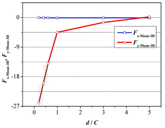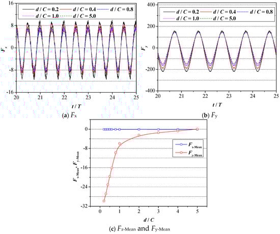 When it comes to the lift force, as seen in Figure 10b, the variation curve at a certain ground distance also exhibits periodic change, and only one peak value and valley value show up in a complete motion period, meaning that the changing period of the lift force is identical to that of motion period. Apart from that, it can be clearly seen from Figure 10b that the variation curves of the lift force at d/C = 5.0 are almost symmetrical with respect to the x-axis, namely the corresponding mean value should be equal to zero. With a further decrease in the ground distance, the corresponding symmetry was disrupted; namely, that the variation curve of the lift force is no longer symmetric to the x-axis. Specifically, the peak value of the lift force remains almost unchanged while the corresponding magnitude of the valley value keeps diminishing, and the smaller the value of the wall distance is, the greater the reduction. As for the corresponding value of CL-Mean, as seen in Figure 10c, the consistent decrease in the wall distance results in a continuous decrease in the lift force and the enlargement of asymmetry.