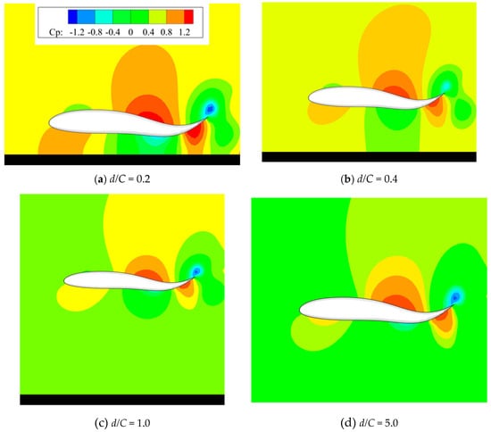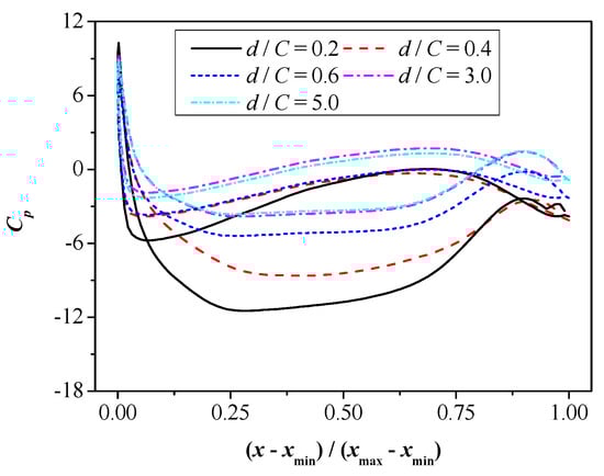 As shown in Figure 11, the decrease in the wall distance leads to the consistent growth of the foil’s pressure difference, which may explain why the corresponding lift force increases consistently. This conclusion is consistent with that in Figure 10b. Specifically, when the distance alters from d/C = 5.0 to d/C = 3.0, although there exists an increase in the foil’s pressure, the increasing magnitude is relatively small. Therefore, the corresponding lift force coefficient increases slowly. The variation in the pressure distribution leads to a difference in the corresponding pressure difference between the upper and lower surfaces of the foil. The component of pressure difference along the vertical direction is the lift force, which explains why changes in pressure can affect the lift. With the further decrease in wall distance, in particular, when the distance alters from d/C = 0.4 to d/C = 0.2, the pressure on the upper surface of the foil remains almost unchanged while the relevant value on the lower surface keeps decreasing. Hence, the pressure difference between the upper surface and lower surface also presents a sharp increase, leading to the enlargement of the value of the lift force.