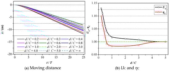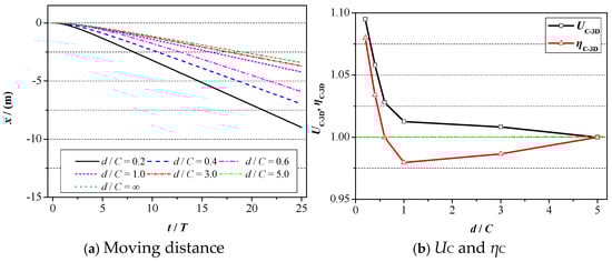 Next, the ground wall effect on the propulsive property of 2D foil will be analyzed, and the corresponding results are plotted in Figure 12. Specifically, the moving distance of foil with respect to motion time is plotted in Figure 12a, where x denotes the abscissa of foil’s gravity. The values of relative propulsive efficiency (ηC) and moving velocity (UC) are summarized in Figure 12b. It is worth noting that in order to more obviously demonstrate the ground wall effect on the propulsive property, the value of propulsive efficiency and moving velocity under the condition of d/C = 5 is denoted as the reference value, and the corresponding values under other wall distances are equal to the ratio of the reference value.