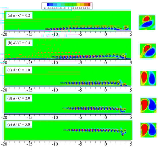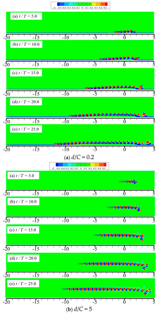 Figure 13 presents the vortex structures of 2D foil under various motion times, where Z denotes the vortex magnitude along the z-axis direction and the corresponding definition is expressed as . As seen in Figure 13, at the initial time of the foil’s motion, two kinds of vortex structures with different rotation directions emerge on the upper and lower surfaces of the foil. With the further motion of the foil, the detached vortex structures start falling off, and the vortex ring structure is formed. As is known from Figure 12, the acceleration and moving velocity of the foil at the initial time are pretty low; therefore, the distance between the two adjacent vortex rings is also very small. With the further increase in motion time, the vortex structures in the wake of the foil are stretched, and the distance between two adjacent structures is also enlarged. Apart from that, there also exist many differences in vortex structures when the wall distance keeps decreasing. Specifically, when d/C = 0.2 (as seen in Figure 13a), the vortex structures shedding from the foil start to emerge with the vortex structures on the surface of the ground wall and move together along the flow direction, forming a flat structure.