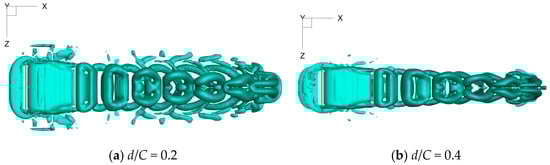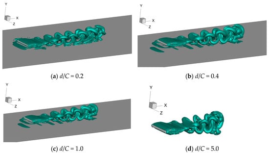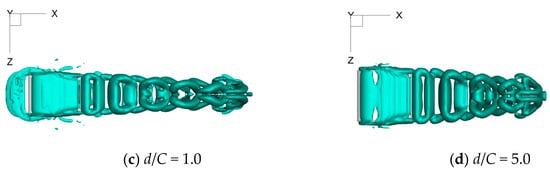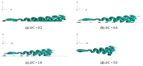 Moreover, it can also be seen from Figure 19 and Figure 20 that the span length of the vortex structure keeps reducing during the process of the foil’s forward motion, which is consistent with that of the constrained mode state [27]. When the distance alters from d/C = 5.0 to d/C = 1.0, the corresponding span length reduces quickly, and much energy is dissipated, leading to a decrease in propulsive efficiency. However, as the wall distance decreases further, the vortex structure’s span length exhibits a gradual growth tendency. In particular, when d/C = 0.2, the span length of the vortex structure is larger than the foil’s span length, and the energy dissipation reaches its lowest value, which is why the value of η climbs to the peak.