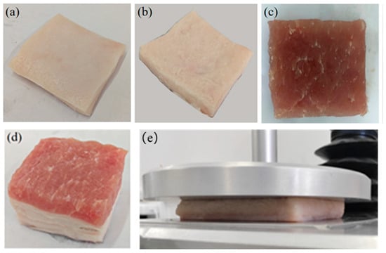 For our experiment, pork meat was procured from the Yingbin Vegetable Market in Jinnan District, Tianjin, China. The skin, subcutaneous tissue, and muscle specimens were meticulously prepared by dissecting each layer with a sharp scalpel blade and shaping them into blocks approximately 50 mm in length and width. Multi-layer soft tissue specimens, with dimensions similar in length and width to the single-layer ones, were also prepared. Representative images of some specimens are depicted in Figure 1. To ensure the reliability of our findings, at least 3 specimens of each soft tissue type were prepared for repetitive experiments.