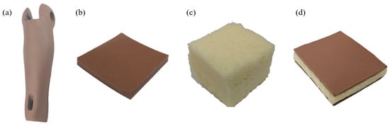 Photo of the dummy skin specimen: (a) the arm skin of a dummy; (b) rubber; (c) sponge; (d) multi-layer dummy skin material.