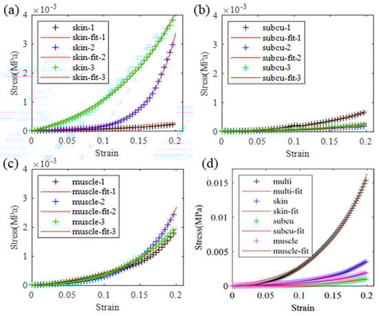 A total of twelve pork back tissue specimens, comprising skin, subcutaneous, muscle, and full-thickness multi-layer samples, with three of each type, were measured. The average dimensions of each specimen type are detailed in Table 1. The stress–strain curves obtained from the compression tests with 1 mm/s loading speed for the skin, subcutaneous, muscle, and multi-layer samples are presented in Figure 3. Each tissue type was subjected to three tests. It can be seen that the measurement results remain closely consistent, except for the curves in Figure 3a, where the bottom curve may have been affected by specimen irregularities. Consequently, only the upper two curves were considered for averaging purposes. The averaged stress–strain curves for each type of single-layer and the multi-layer samples are depicted in Figure 3d.