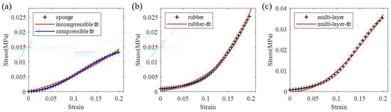 By fitting the curves from Figure 3 and Figure 4 using the one-term Ogden model as per Equation (1), the parameters μ and a were determined and are presented in Table 1. The fitting error was calculated by Equation (4). It can be seen that the errors for soft tissue and rubber specimens are small (less than 6 × 10−7), which means they can be well described by the one-term Ogden model. Notably, the error is higher for sponge and multi-layer dummy skin specimens. However, the error can be significantly reduced when employing a three-term Ogden model with the assumption of compressible material, as illustrated in Figure 4a.