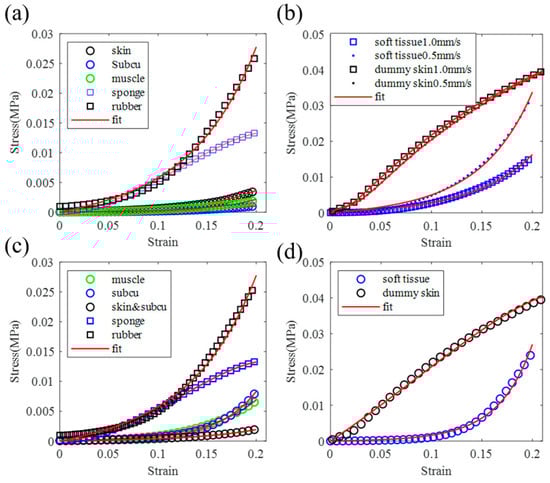 Due to the potential for permanent tissue deformation at high strain levels, each specimen was tested only once. However, to maintain experimental rigor, three specimens were prepared for each tissue type, resulting in three tests for each soft tissue type. This approach led to a total of 12 tests for each series of soft tissue tests, with 3 tests each for skin, subcutaneous tissue, muscle, and multi-layer tissue. For dummy skin samples, a 2.0 N preload was applied. The stress–strain curves of all the tests were fitted using the Ogden hyperelastic model []. In the uniaxial compression mode, with assumptions of isotropic, incompressible material, the engineering stress is formulated as follows []: