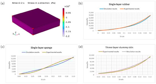 Finite element analysis of dummy skin. (a) Three-layer dummy skin model and z-direction stress distribution at 2.2 s; (b) Comparison of stress–strain curves of single-layer rubber specimen. (c) Comparison of stress–strain curves of single-layer sponge specimen. (d) Comparison of stress–strain curves of three-layer dummy skin.