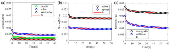 Stress relaxation measurement results of soft tissue and dummy skin with a constant strain of 20%. (a) Stress relaxation curves of soft tissue specimens, where “subcu” represents subcutaneous specimen, and “skin and subcu” represents a skin and subcutaneous bi-layer specimen. (b) Stress relaxation curves of rubber and sponge specimens. (c) Stress relaxation curves of full-thickness multi-layer dummy skin soft tissue specimens.