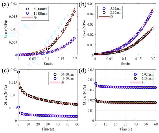 where E0 is the initial elastic modulus; σ(t) is the stress at time t; Ei represents the elastic moduli; and τi represents the relaxation times of each Maxwell element. Through curve fittings, both the hyperelastic and viscoelastic material parameters were calculated.