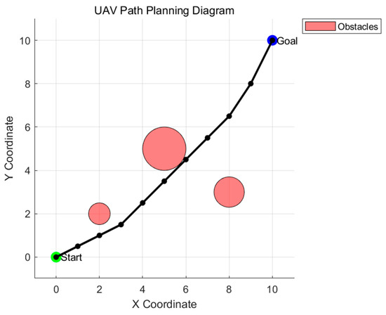 Amid the relentless advancement of technology and the escalating demands of human production and daily life, small unmanned aerial vehicles (UAVs) have garnered significant attention due to their myriad advantages—such as flexible configurations, compact dimensions, and robust adaptability. Currently, they are extensively employed in reconnaissance and surveillance [1], urban logistics [2], power grid inspections [3], firefighting and rescue operations [4], and urban patrolling [5], among numerous other domains. These attributes empower UAVs not only to effectively assist humans but even to entirely supplant human involvement in various scenarios, including tracking, exploration, transportation, and military missions [6]. In UAV technology, path planning serves as the cornerstone for achieving UAV autonomy. It furnishes the essential technical support to ensure that UAVs can navigate safely and efficiently from the starting point to the destination. Figure 1 below illustrates the simplified process of UAV flight path planning. The pink areas represent obstacles. The UAV must navigate from the starting point to the endpoint while avoiding these pink obstacles.