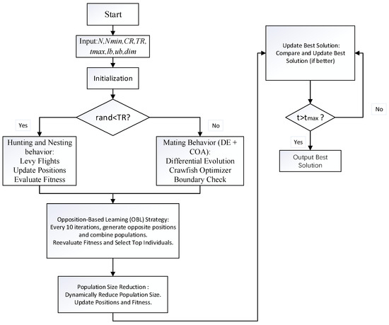 The workflow of the improved algorithm is as follows. Initialization phase: The algorithm begins by generating an initial population of n individuals, each with a dimensionality of d, and positions randomly distributed within the defined upper and lower bounds. Parameters such as TR, Cr, and mutation factors are initialized. Through the opposition-based learning strategy, the population size is expanded by computing the opposite solutions for each individual. The original population is merged with these opposite solutions to form a new population. Fitness evaluations are performed on this new population, and the n individuals with the best fitness are selected as the initial population, initializing the optimal solution. Main loop phase: In each iteration of the generation, parameters are updated based on the current iteration count t. The dynamic adjustment of these parameters helps balance the trade-off between the exploration and exploitation phases. With a certain probability, the algorithm executes the exploration phase (hunting and nesting behaviors). During this phase, individuals update their positions according to Lévy flight patterns or based on the differences with other individuals. By calculating randomly generated parameters, the movement strategies of individuals are determined, aiming to increase population diversity and enhance global search capabilities. If the conditions for the exploration phase are not met, the exploitation phase is executed. At this stage, the algorithm integrates the characteristics of Differential Evolution (DE) and the Crayfish Optimization Algorithm (COA) to update individuals. After every 10 generations, the algorithm applies the opposition-based learning (OBL) strategy. At this point, opposite solutions for the individuals in the population are regenerated and combined with the current population to update the optimal solution. The OBL strategy aids in expanding the coverage of the search space, improving the algorithm’s diversity and global search ability. At the end of each generation, the algorithm adjusts the population size based on the current generation number t. Starting with an initial population size of n, the population size gradually decreases as the iterations progress until it reaches the minimum population size. This size adjustment strategy assists in conducting extensive exploration during the early stages and facilitates local exploitation in the later stages. Subsequently, the optimal solution of each generation is stored, and the optimal fitness value of the current generation is calculated to form a convergence curve. This curve reflects the algorithm’s convergence speed during the search process and the evolution of the optimal solution. When the maximum number of iterations is reached, the algorithm terminates. At this point, the optimal solution obtained is the final result of the algorithm. The specific algorithmic workflow is depicted in Figure 5.