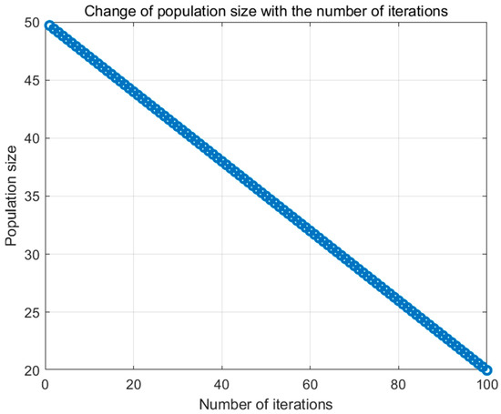 Here, denotes the initial population size (i.e., the population size at ), and signifies the maximum number of iterations. As illustrated in Figure 6, Equation (26) demonstrates that the population size progressively diminishes with increasing iterations. A larger population size during the initial stages facilitates extensive exploration of the solution space, thereby avoiding local optima. Conversely, a smaller population size in the later stages concentrates the search within promising regions, thereby accelerating convergence. This gradual reduction mechanism reduces computational overhead, automates the adjustment of population size, minimizes the complexity of manual parameter tuning, and effectively balances exploration and exploitation. Consequently, it enhances the overall performance of the algorithm and aids in locating the global optimal solution.