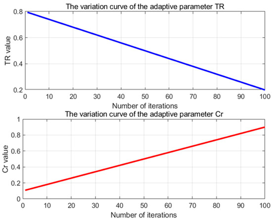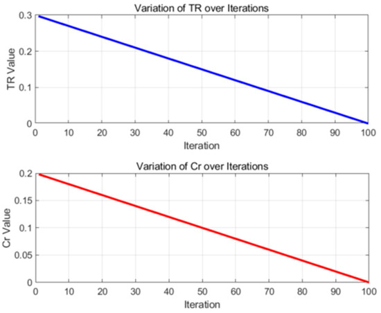 TR (trade-off probability) governs the balance between hunting and mating behaviors within the algorithm. Cr (crossover probability) controls the likelihood of crossover operations. As the number of iterations increases, gradually decreasing TR and Cr allows the algorithm to be more exploratory in the early stages and more exploitative in the later stages, thereby enhancing the convergence speed and solution accuracy. Consequently, a linear decay approach is employed, reducing these parameters incrementally from their initial values to zero. Here, represents the current iteration count, and denotes the maximum number of iterations.
