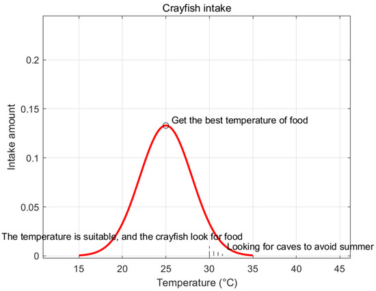 In Equation (29), temperature changes influence the foraging behavior of crayfish, thereby controlling the balance between exploration and exploitation. Here, represents the temperature of the crayfish’s environment.