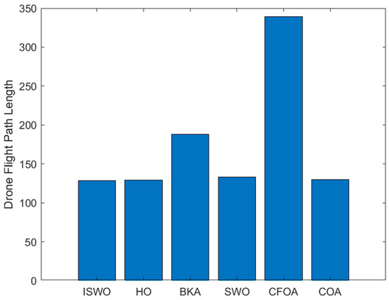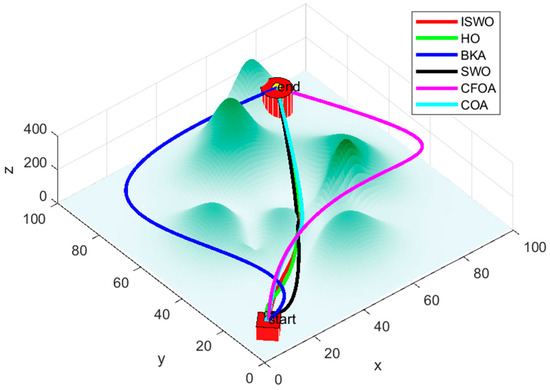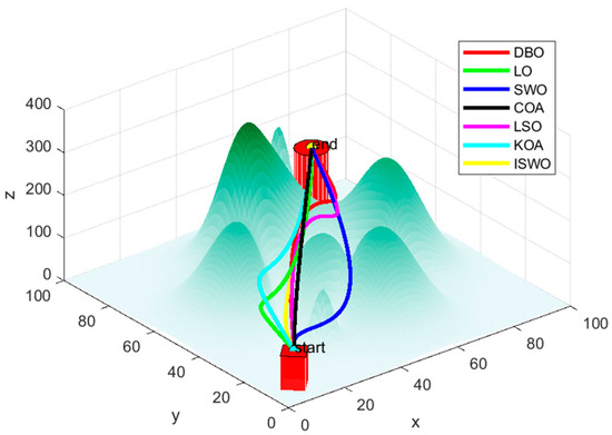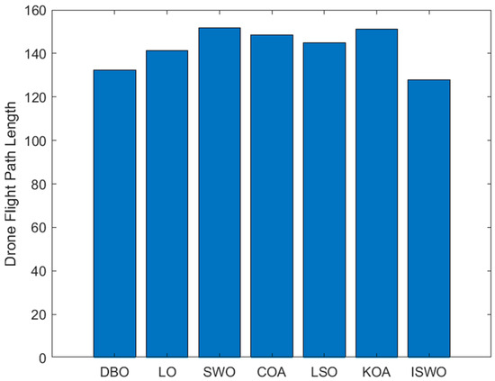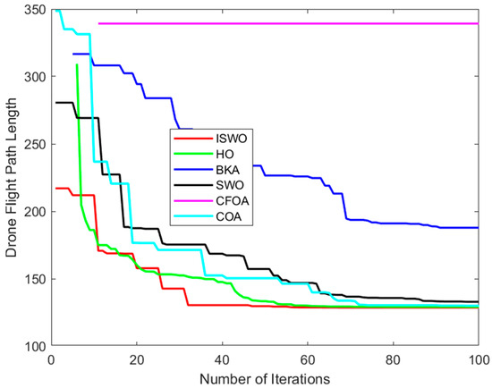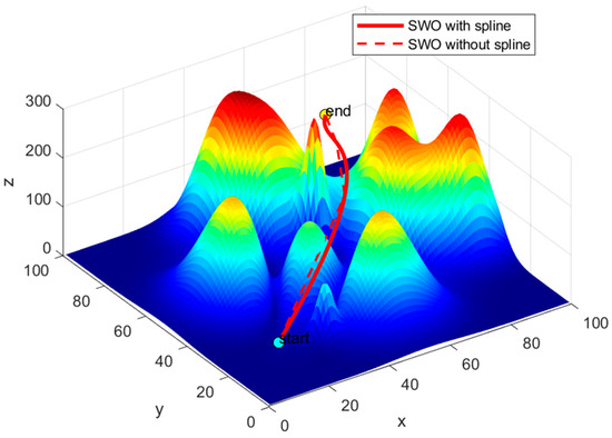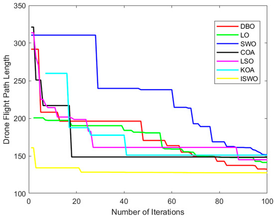 The second category involves physics-based algorithms, such as the Kepler Optimization Algorithm (KOA) [13], Light Spectrum Optimizer (LSO) [14], and the Sine Cosine Algorithm (SCA) [15]. There are also human-inspired metaheuristic algorithms, including the Gold Rush Optimizer (GRO) [16] and the Catch Fish Optimization Algorithm (CFOA) [17]. Based on the simulation experiments of path planning described below, it was discovered that the CFOA algorithm, newly proposed this year, exhibits inefficiency in engineering applications. Additionally, it demonstrates low stability and reliability on the CEC2017 [18] test suite. The HO and BKA algorithms, when tested on benchmark functions, display higher maximum, average, and minimum values across multiple test functions, indicating a propensity to become trapped in local optima and a lack of global search capability. The COA algorithm lacks robust global exploration ability and is particularly prone to local optima during the later stages of optimization. The DBO algorithm may suffer from insufficient search efficiency in high-dimensional and complex problems, leading to slower convergence rates. The LO algorithm requires improvements in search efficiency when applied to complex three-dimensional UAV path planning. The PSO algorithm tends to converge prematurely during the early stages of the search, potentially missing the global optimal solution. The SCA algorithm exhibits periodicity in its search process, making it susceptible to the influence of local optima and reducing its ability to dynamically adapt during the search. The GRO algorithm may prematurely converge to local optima when individual behaviors become overly homogeneous, thus limiting global exploration. This paper introduces a new nature-inspired metaheuristic algorithm, the Spider Wasp Optimizer (SWO) [19], which incorporates multiple unique update strategies and is applicable to various optimization problems with differing exploration and exploitation requirements. The effectiveness of SWO was evaluated using several mathematical benchmarks and real-world optimization problems. Although SWO offers advantages in UAV path planning, such as efficient global search capabilities and strong convergence performance, it simulates relatively complex biological behaviors, resulting in high computational complexity. When addressing high-dimensional path planning problems, it may consume substantial computational resources, which is disadvantageous for resource-constrained embedded UAV systems. Therefore, during the iterative process, an Improved Spider Wasp Optimizer (ISWO) updates the positions of search agents through hunting and nesting behaviors (exploration phase) and mating behaviors (exploitation phase). In the hunting and nesting behaviors, strategies like dynamic parameter adjustment and Lévy flights [20] are employed to enhance the exploration ability of the solutions. Differential Evolution (DE) [21] generates new candidate solutions through mutation and crossover operations during the mating phase, maintaining population diversity and promoting search efficiency. COA optimizes individual positions during the mating phase by combining the foraging and avoidance mechanisms of COA, enhancing local search capability. Furthermore, the algorithm re-applies the opposition-based learning [22] strategy that generates opposite solutions periodically during initialization and iterations, expanding the search space and enhancing global search capability. To reduce computational load and accelerate convergence, the algorithm adopts a population size reduction strategy, gradually decreasing the number of search agents. Experimental results indicate that the Improved Spider Wasp Optimizer exhibits faster convergence rates and higher solution quality when solving complex optimization problems, validating the importance of integrating multiple optimization strategies and opposition-based learning. Moreover, the ISWO algorithm achieved the best performance on the CEC2017 test suite.