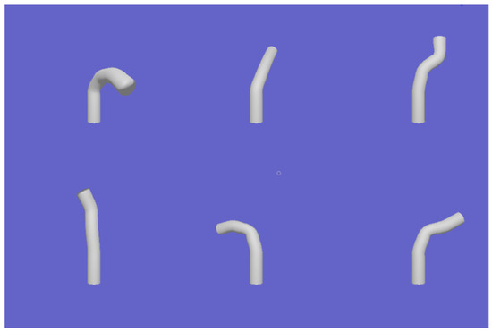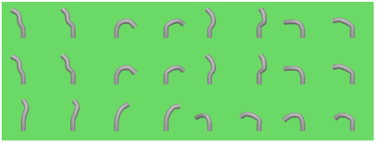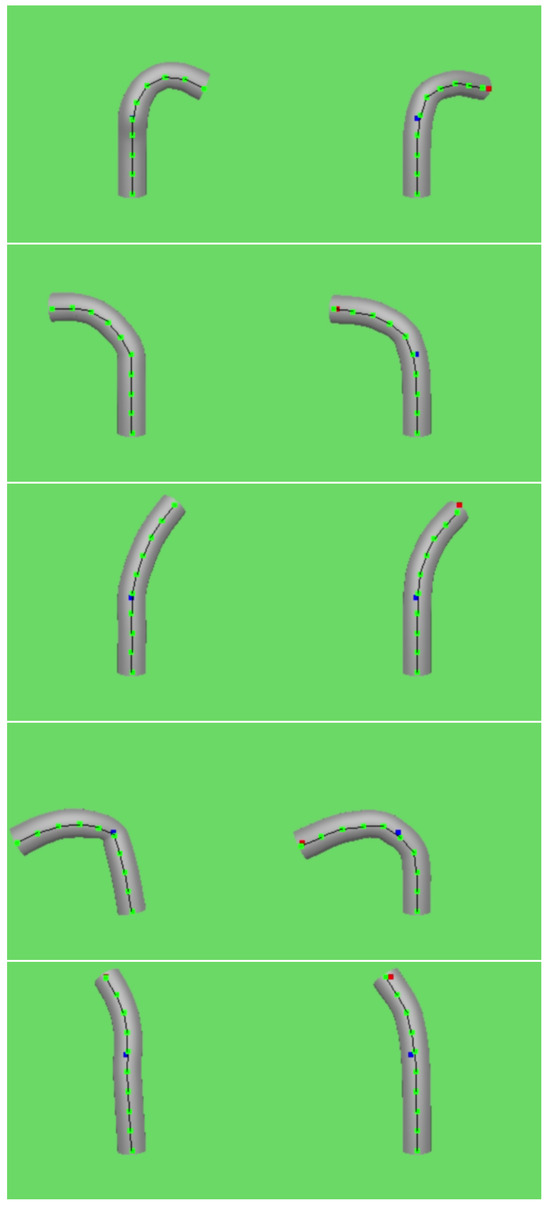 First, we validated the encoder network by confirming that it can directly compute the corresponding shape output from motor inputs, effectively achieving shape estimation analogous to solving forward kinematics. By manipulating the control handle, we influenced the relative positions of the joints based on the functional relationships defined in the simulation model, inducing deformations in the flexible continuum and obtaining the actual shape output. Simultaneously, the encoder network processed the input signal to calculate the joints’ relative positions, which were then mapped onto the bone joints to generate the simulation output. As illustrated in Figure 5, the left side represents the shape output from the simulation model, while the right side shows the shape predicted by the encoder network. Overall, the predicted shape closely approximates the actual shape, though certain errors are observed in the bending of certain joints. Notably, the prediction error increases when the instrument shape features a high degree of curvature.