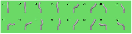 Shape Prediction Results of 8 Bending States: The left side (a1–h1) displays the actual shape, while the right side (a2–h2) presents the shape predicted by the network.