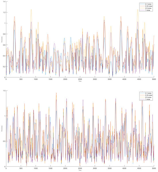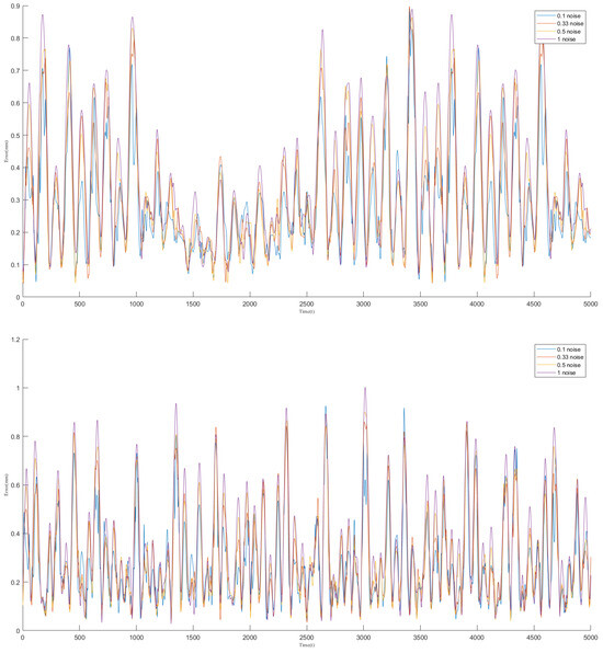 The average joint deviation for Validation Dataset 1 and Validation Dataset 2. The horizontal axis represents the sampling time points, while the vertical axis indicates the corresponding average joint deviation. The lines in different colors represent the network results under various noise training conditions.
