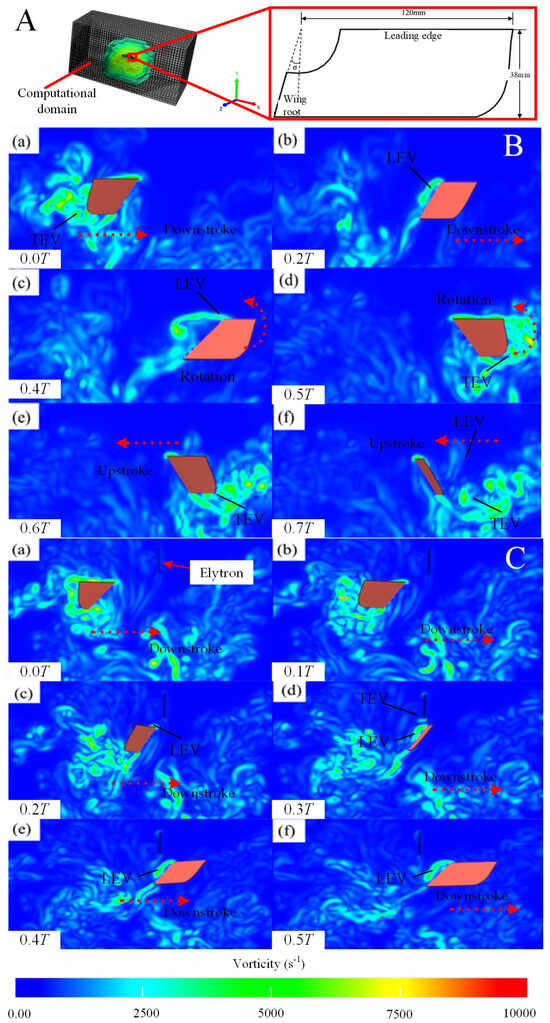 - Le, T.Q.; Van Truong, T.; Tran, H.T.; Park, S.H.; Ko, J.H.; Park, H.C.; Yoon, K.J.; Byun, D. Two-and three-dimensional simulations of beetle hind wing flapping during free forward flight. J. Bionic Eng. 2013, 10, 316–328. [Google Scholar] [CrossRef]