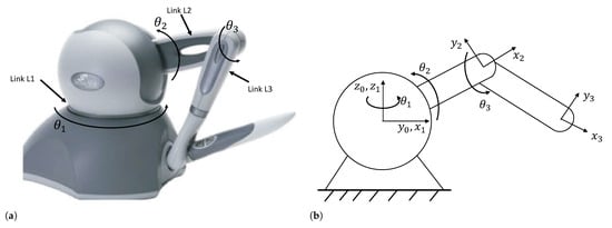 Among them, , , and ∈ represent the joint position, joint velocity, and joint acceleration, respectively. ∈ expresses the inertia matrix, ∈ represents the centripetal and Coriolis torque, ∈ is the gravitational force, ∈ is the to the joint torques, and is a random interference. In this paper, the Phantom Omni robot is studied. The robot is shown in Figure 1a. The schematic diagram of the Phantom Omni is shown in Figure 1b, in which the reference frames used in dynamics are outlined [30]. The robot is a 3-DoF manipulator and is modeled by Equation (1), and the M, C, and G matrices are as follow [31]: